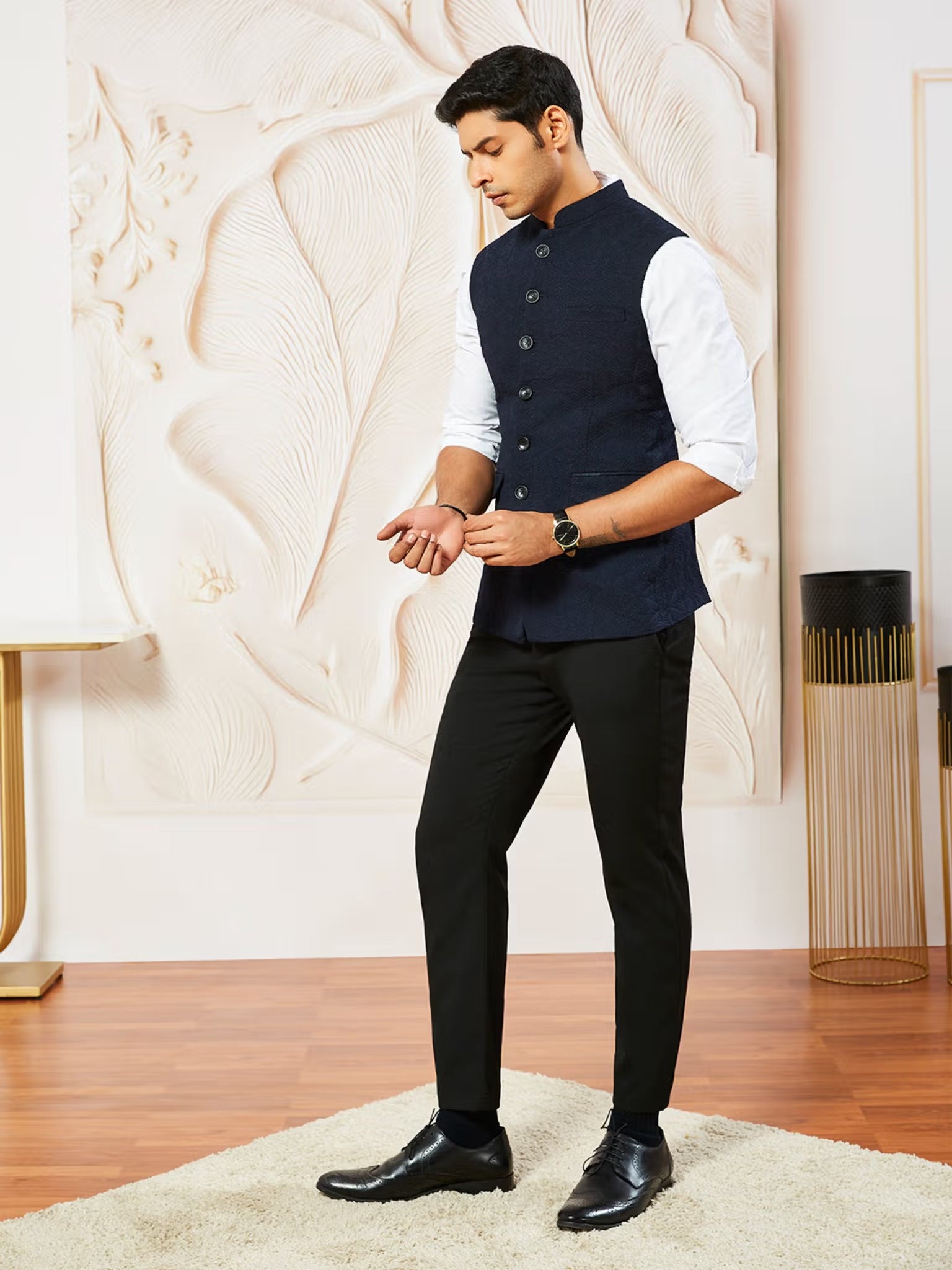 This Maharaj Nehru jacket, crafted from a luxurious silk-blend embossed fabric, blends timeless elegance with modern craftsmanship. The stand-up collar, refined texture, and streamlined fit create a sophisticated look ideal for festive events, ceremonies, and formal occasions. Lightweight and comfortable, the jacket’s raised pattern adds an instantly polished finish.