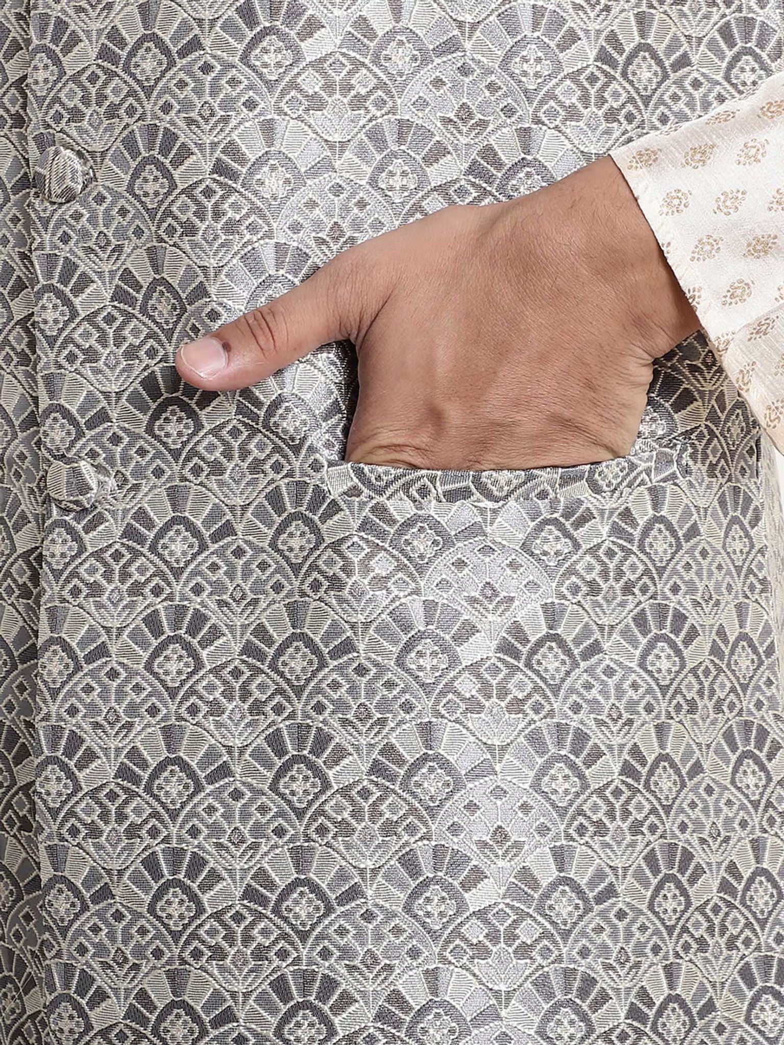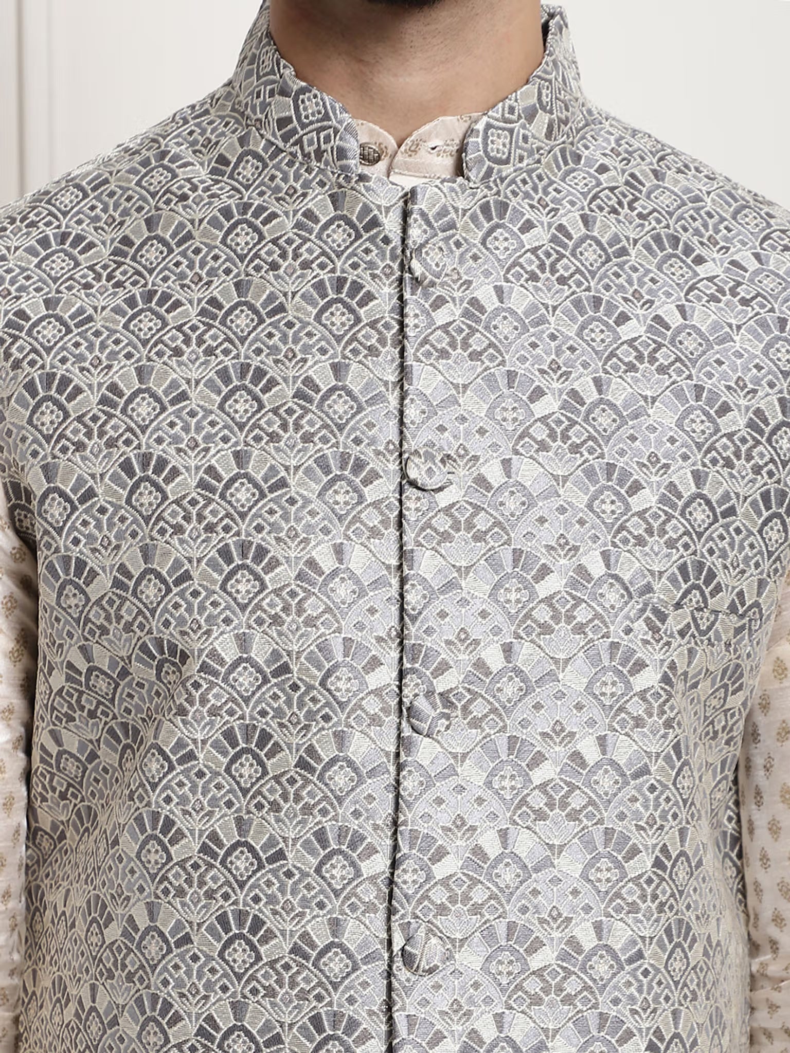 Deze grijze Nehru-jas van jacquardzijde combineert moderne stijl met klassieke elegantie. Het rijke jacquard-weefsel zorgt voor een verfijnde textuur en de subtiele grijstint geeft een tijdloze, veelzijdige look. Dankzij de klassieke Nehru-kraag en de comfortabele regular fit is dit jasje ideaal voor bruiloften, ceremonies en andere stijlvolle gelegenheden. Een perfecte keuze voor wie een elegante en toch opvallende outfit wil samenstellen.