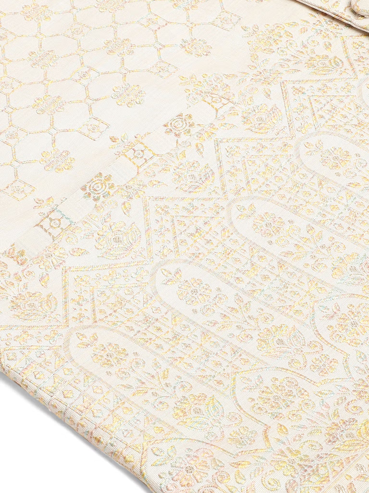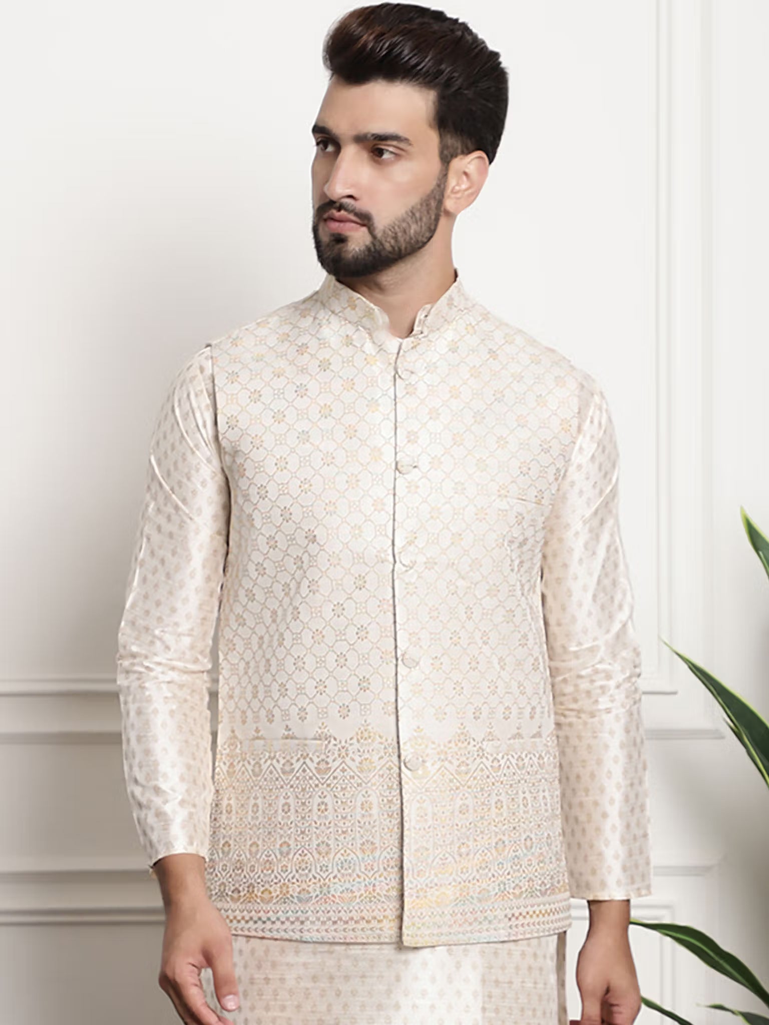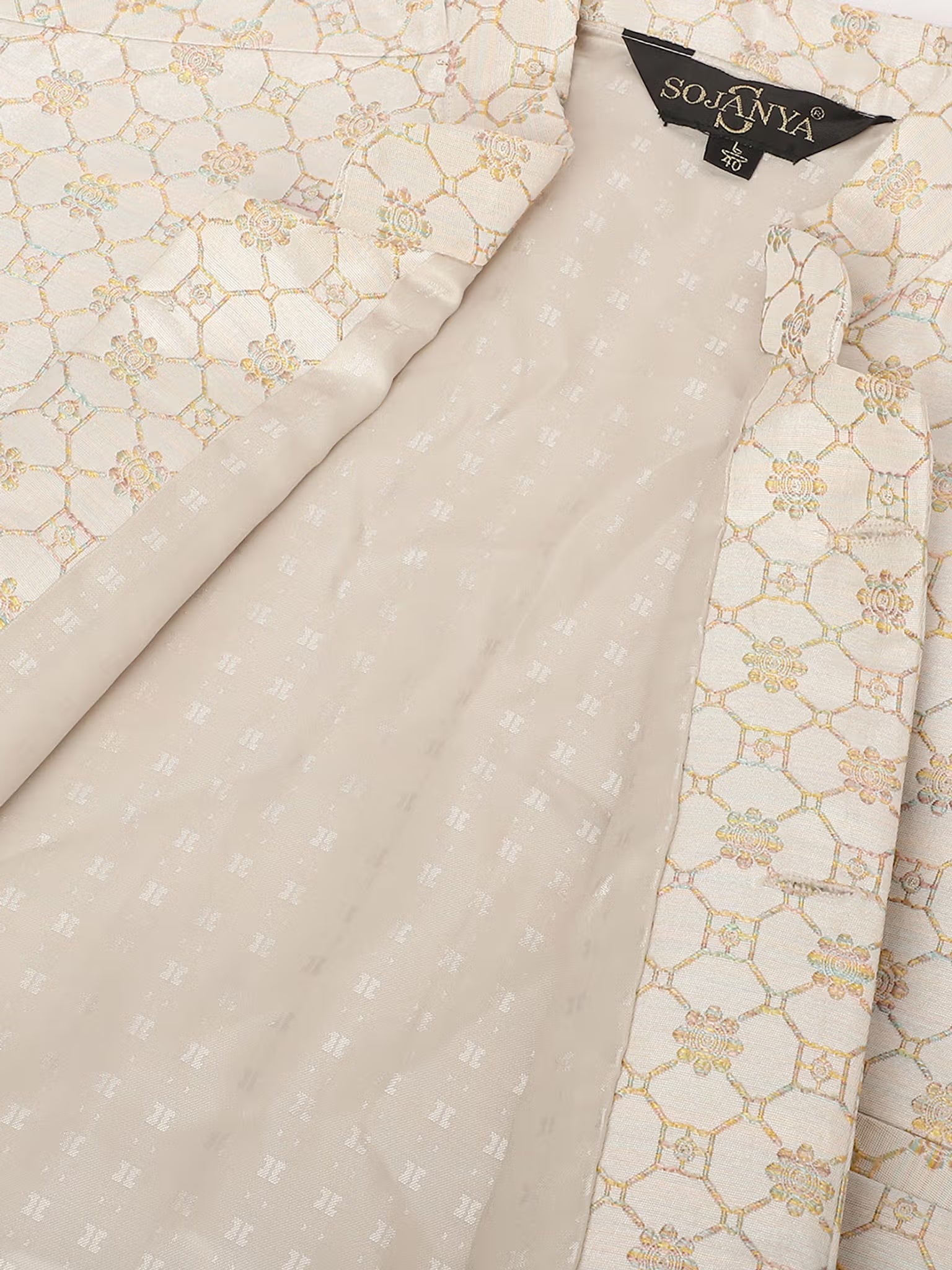 This cream-colored Sojanya Nehru jacket in jacquard silk blends luxury with refined traditional detailing. The rich woven texture adds elegance, while the traditional design work at the bottom enhances its festive appeal. With its classic Nehru collar and comfortable regular fit, it's perfect for weddings, celebrations, and formal occasions.